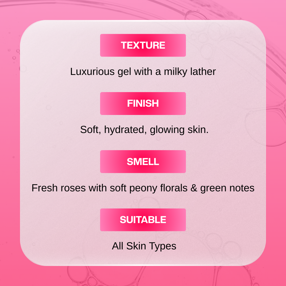 Aqua, Sorbitol, Cocamidopropyl Betaine, Glycerin, Caprylyl/Capryl Glucoside, Sodium Methyl Cocoyl Taurate, PEG-150 Distearate, Sodium Lauroyl Sarcosinate, PEG-40 Hydrogenated Castor Oil, Coco-Glucoside (and) Glyceryl Oleate, Rosa Damascena Flower Water (and) Sodium Benzoate (and) Gluconolactone (and) Calcium Gluconate, Paeonia Suffruticosa (Peony) Flower Extract, Aloe Barbadensis Leaf Juice, Cocos Nucifera (Coconut) Fruit Extract, Glycerin (and) Aqua (and) Glycyrrhiza Glabra (Licorice) Root Extract, Camellia Sinensis (Green Tea) Leaf Extract, Rosa Rubiginosa (Rosehip) Seed Oil, Shea Butter Ethyl Esters, Metricaria Recutita (Chamomile) Flower Oil, Perfume, Methylchloroisothiazolinone (and) Methylisothiazolinone, Disodium EDTA