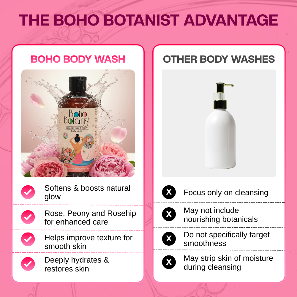 Indulge your skin in the luxury of nature with Boho Botanist Bulgarian Rose & Peony Body Wash. Crafted with the goodness of Bulgarian rose, radiant peony extracts, and nourishing rosehip oil, this gentle cleanser does more than just wash—it hydrates, restores, and refreshes your skin.